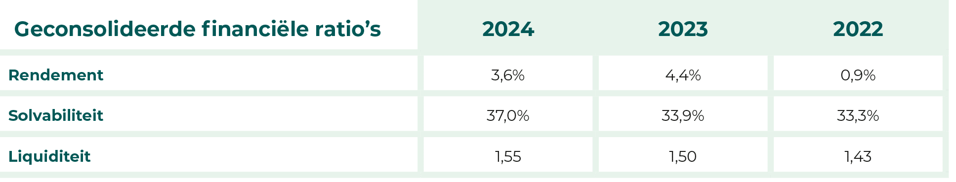 Solvabiliteit laat de mate zien waarin de organisatie in staat is om financiële tegenslagen op te vangen en wordt berekend door het eigen vermogen te delen door het balanstotaal. Door het resultaat over 2024 neemt de solvabiliteit toe tot 36,9%. Een solvabiliteit van boven de 25% wordt als financieel gezond aangemerkt.